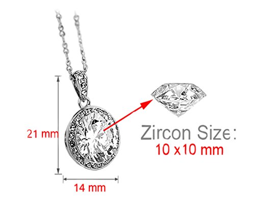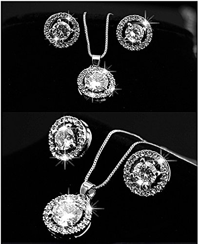 SIZE:Pendant Height:0.6 inches. Andjustable Chain Length: 16 inches+2 inches of extension. Earrings diameter : 0.5 inches, Earrings Stone diameter :0.3 inches.. Main Stone: AAA Swiss Cubic Zirconia. Stone Color: Clear. Stone Shape: Round.Metal Type: Eco-friendly White Gold Plated Stainless steal