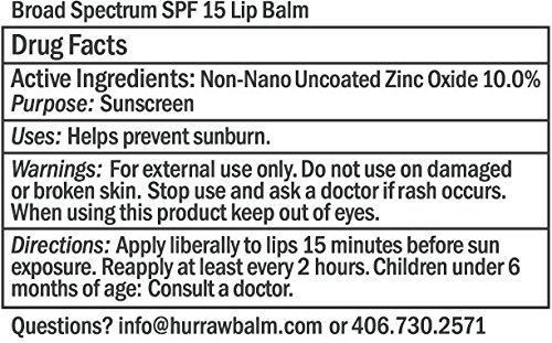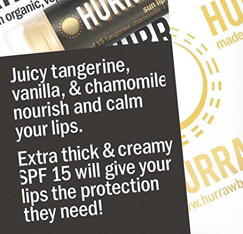 - ONE 4.3g/15oz Oval Tube of SUN Hurraw! Lip Balm. SPF 15. Zinc Oxide Sun Protection with Tangerine and Chamomile. Glides on silky smooth and virtually CLEAR! Made with Premium Organic, Vegan and Raw Ingredients. Hurraw! Balms are Cruelty Free, GMO Free and Gluten Free. Simply, the Best Luxury Lip Balm MADE IN THE USA.
