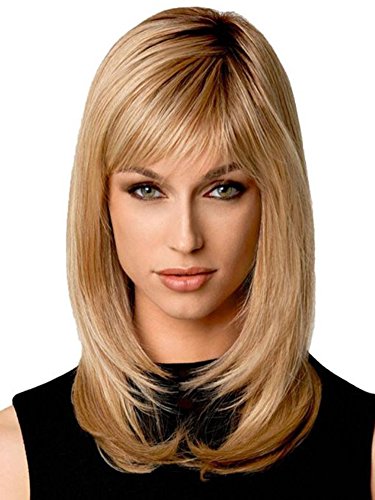 WIG APPEARANCE:Natural human hair feeling women stylish middle length bob straight blonde hair wigs with bangs, comfortable and fashion.