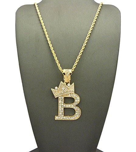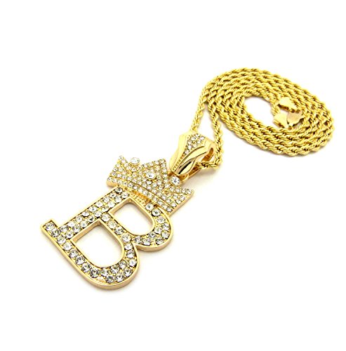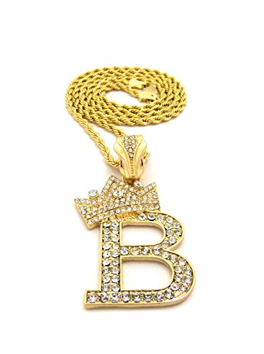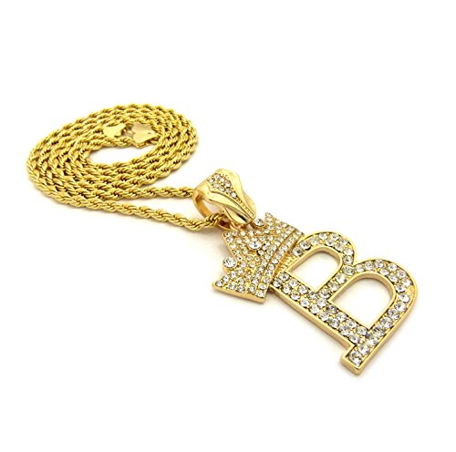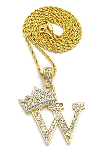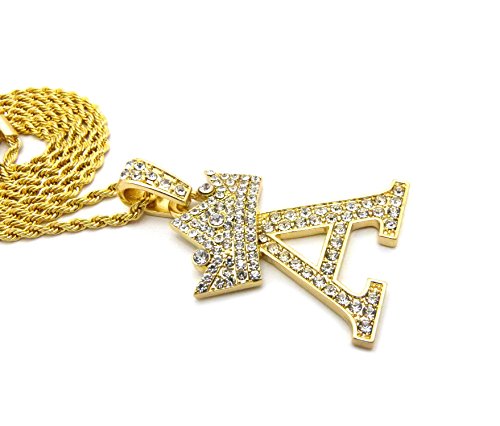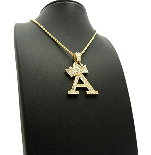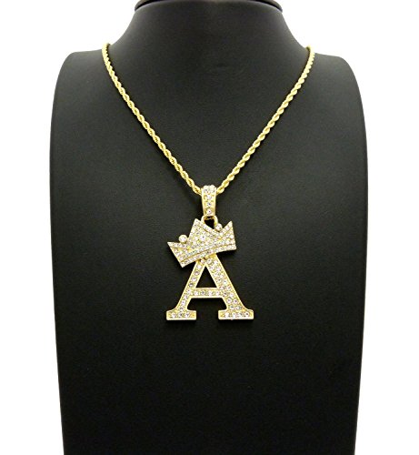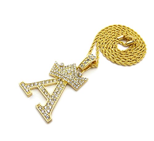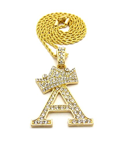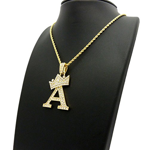 -. Feature : Crown Gold-Tone Iced Out King Crown Initial Letters Pendant 24" Rope Chain Necklace / Pendant Size: Approximately 1.5" x 2" Inches / Chain: 24" Inches, 2mm Rope Chain / Fashion Costume Jewelry-Imitation Gold, Silver Tone Plated. / Makes a great gift for special occasions.