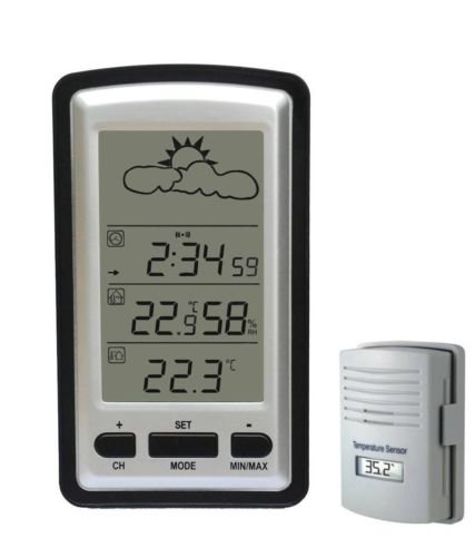 - Feature : At a glance, Large Screen 4" LCD screen with backlight shows weather forecast icons quickly tell if it is going to be rainy, sunny, cloudy, snowy, how cold, how hot, and how humid. / Integrated Wireless sensors(can receive up to 3 sensors) easily monitor indoor humidity for baby's room, server computer closets, elderly care room, wine cellar, mechanical rooms, and any areas where environmental conditions matter. Can be free standing or wall mounted. / Digital alarm clock with snooze, atomic radio controlled clock and electronic calendar to help as reminders for medication for the elderly / Portable, weighing less than 9 ounces, can easily serve as a Travel Clock / Indoor Humidity Range 20% to 99% RH. Provides Storm Alarm and Time Alarm.Visual Weather Forecast and Moon Phase display icons, advanced Technology carries both RoHS and CE certifications.RECEIVER USES 2AA batteries, Sensor 2 AAA batteries.