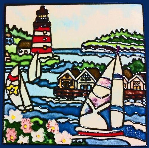 Continental Art Center BD-0766 8 by 8-Inch Lighthouse with Three Sail Boats Ceramic Art Tile