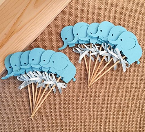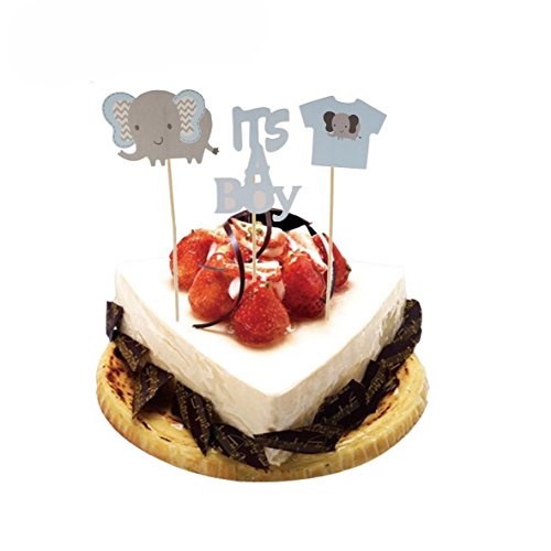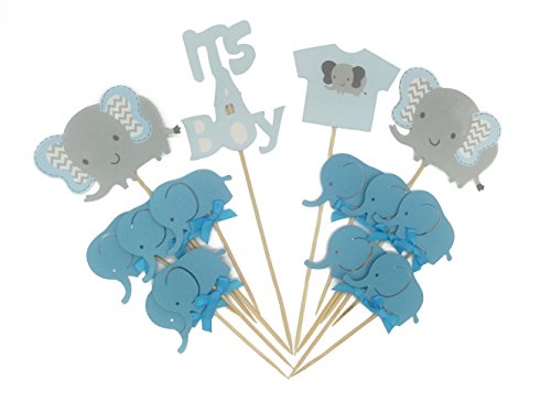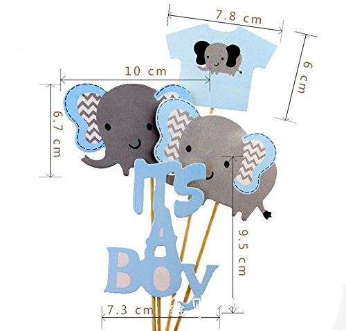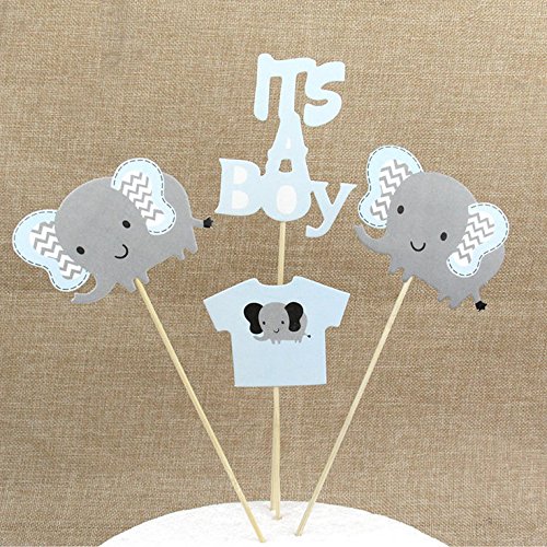 - Blue Elephant Decorations: Elephant Cake Decorations includes 2 blue elephant cake toppers, 1 clothes cake topper, 1 "It's A Boy" cake topper and 10 small elephant cupcake picks, a total of 14.