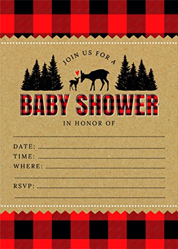 - 24 Rustic woodland lumberjack flannel deer baby shower invites and 24 white envelopes