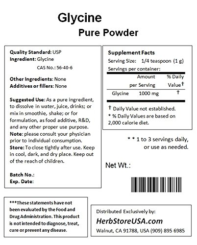 -. Feature : 1000 grams (2.2 lb) Glycine bulk pure powder, USP quality standard. / There is not any additive or filler inside. / White crystalline powder, Sweet taste, Soluble in water; Store in cool and dry place, keep away from strong light and heat. / Bulk pure powder ingredient for direct consumption, formulation, energy drinks, R&D, or your any other business purpose. / Fresh, 1.5 to 2.5 years shelflife available.