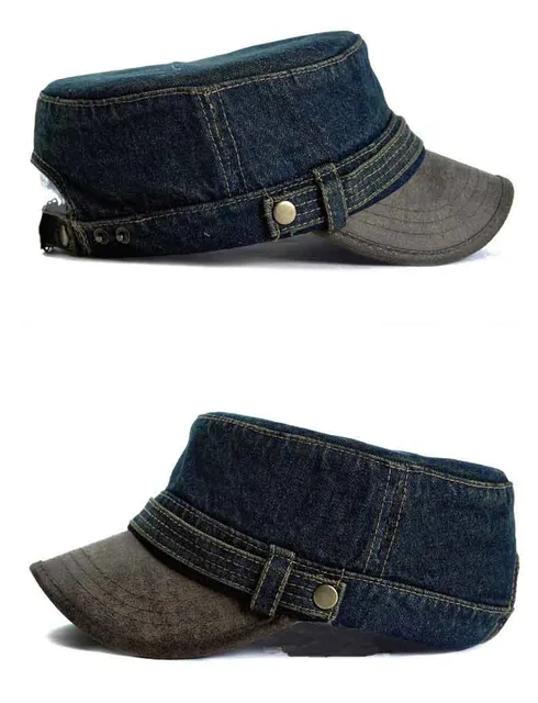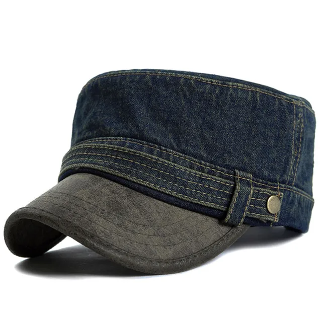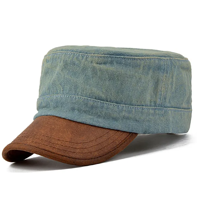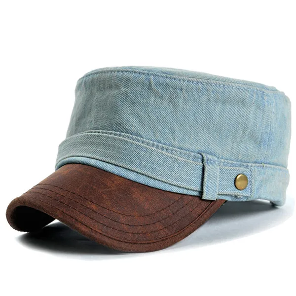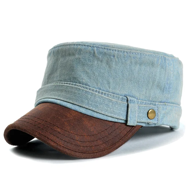 | [해외]남성 여성 데님 가죽 가장자리 평면 모자 봄 가을 야외 캐주얼 평면 상단 캡 조절 야구 모자 트럭 운전사 바이커 |