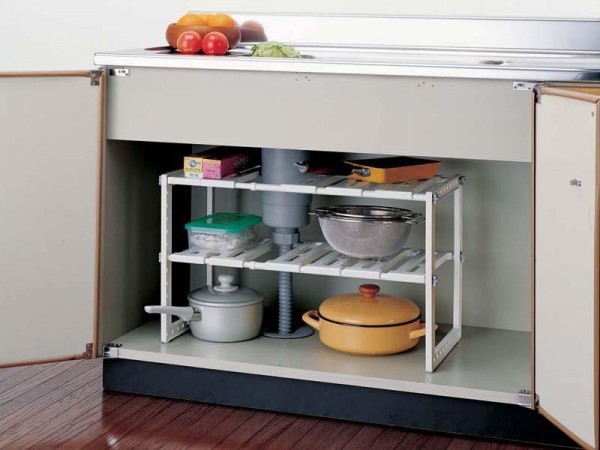 | 組み立てたまま排水トラップを避けて設置できるシンク下ラック♪ |