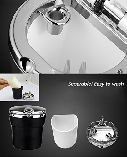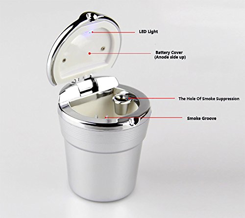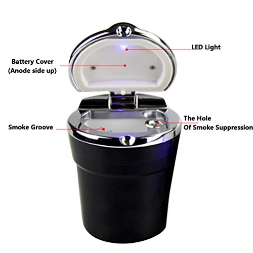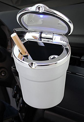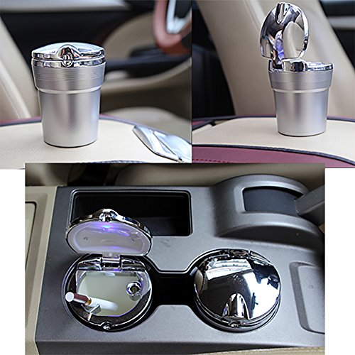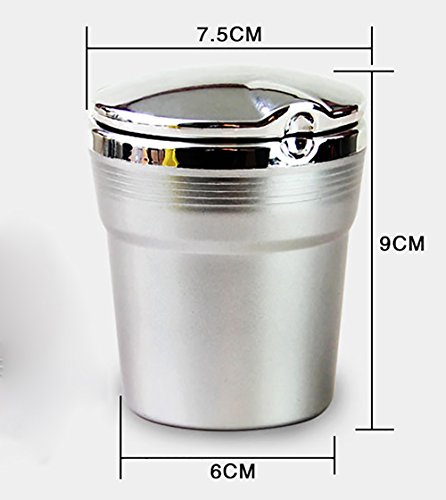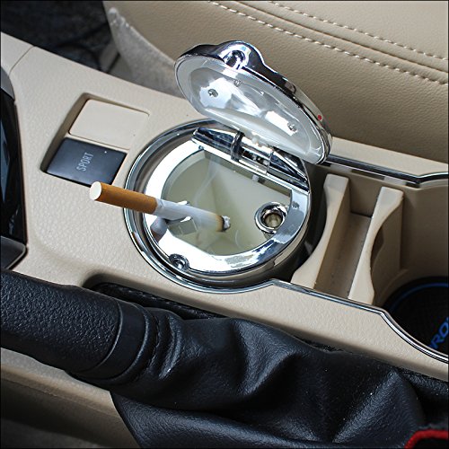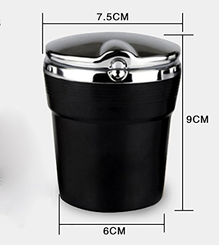 -. Feature : Classic fashion design: Premium luxury design, easy to carry and fits most car cup holders / Easy to use: The cool blue LED light will turn on when the cover is opened; It's more easier and safer to operate at night with inner cool led / Health and safety: Fireproof material ABS, mady by high quality flame-retarded resin / Portable and convenient: It's only 0.53bl, with extinguishing hole, very convenient for you to put the lighted cigarettes into this ashtray while you are driving; Holds ashes allows you the ability to smoke and see where to extinguish cigarettes / Wide range application: Extinguish the butt with lid on, and effectively reduce the harm of secondhand smoke; Ideal for office, home and car use,equipped with snuffer hole and self-cleaning design