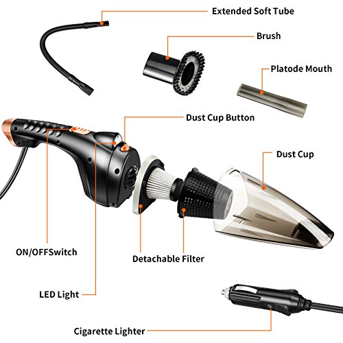 Features: ★Easy to operate, simply plugs to the cigarette lighter, no extra power needed. ★Powerful suction, max comes to 4600PA, effectively clean the dust inside the car. ★5m long power cord, reaches every corner in your car, makes car cleaning easier. ★Detachable stainless HEPA filter, durable and environmental, easy to wash away. ★3 useful attachments: exension pipe, brush, tube, convenient for crevasses and corners cleaning. Specifications: ★Item Name: Car Vacuum Cleaner ★Net Weight: 780g ★Package Weight:1200g ★Input Voltage: DC-12v ★Power: 106W ★Vacuum Degree: ≥4300Pa ★Power Cord Length: 5m (16.4ft) Package includes: ★1X Car Vacuum Cleaner ★1X Brush ★1x Extension Pipe ★1x Soft Hose The item has been well tested, examined and packaged by Welltop before sending off. If there is any problem, welcome to contact us, we would provide the best service for you.Feature