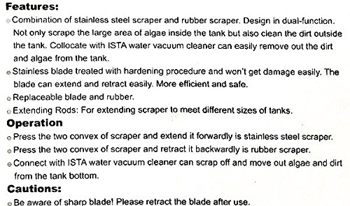 - Feature : ISTA Multi- scraper / Cautions:Be aware of sharp blade!Please retract the blade after use. / Operation:press the two convex of scraper and extend it forwardly is stainless steel scraper.Press the two convex of scraper and retract it backwardly is rubber scraper.Connect with ISTA water vacuum cleaner can scrap off and move out algae and dirt from the tank bottom.