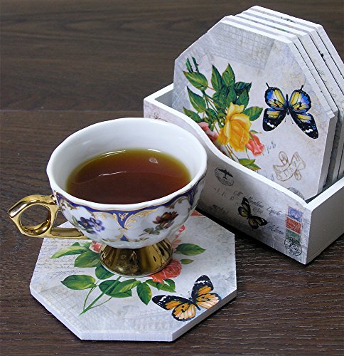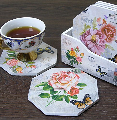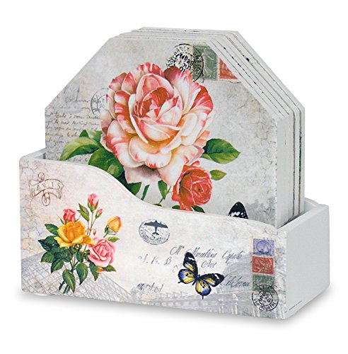Decorative Drink Coasters with Holder - Set of 6 - Assorted Butterfly and Rose Designs - Each Coaster is Printed with a Unique European Vintage Post Card Theme