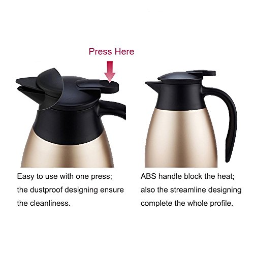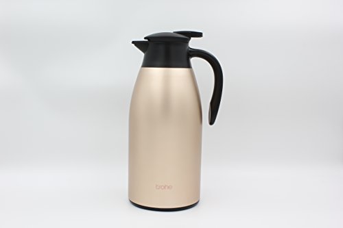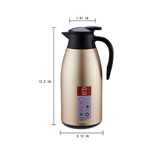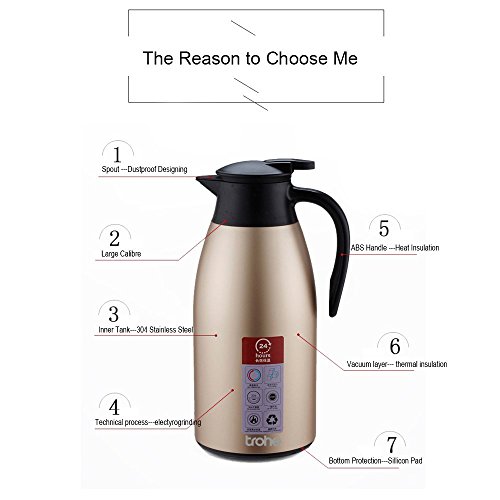 Trohe is a trade company which focus on the green material made product, our purpose is to help people to choose a life style which is simple and organic. our product included the thormes for kicthen and hiking, the product in Trohe, most are simple designing which try to make it easy to use, light to carry. we believe we will do better with your support, thanks for choose Trohe. About the productMaterial: Inner tank is 304 stainless steel; the plastic part is ABS, the stopper is sillicone, the material is harmless for the human body. Structure: Double walled vacuum layer. Bottom mate seamlessly with the plastic part, also for safety considering, added 3 sillicone pads on the bottom, this is effective for keep the carafe stand still. Features:Suitable for HOT or COLD beverages and gravy Suitable for Milk, Coffee Suitable for Wine, Cold drink, Beverages remain hot for up to 12 hours, Stylish design for table service For tabletop and kitchen Also suitable for all fresco dining Capacity: 2L/68Oz large capacity, suitable for a 5 people familly. Size: 2L/68 OZ carafe is around 31M*13CM/12.2In*5.12In Package: Champagne water bottle x 1 Customer Service: we provide high quality finish goods with best service to support. customer's benefit will build our reputation, we guarantee the 100% replace. Good to know1. This is not a toy, please keep it away from kids.2.Do not put carbonated drinks in the jug.3.Keep it away from fire.4.Keep it dry when long time not use. 0 |
