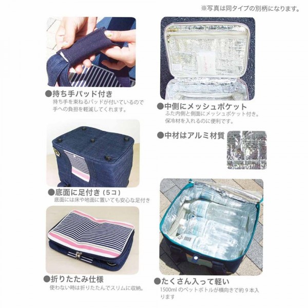 | 仕様 | 開閉:ダブルファスナー仕様 収納量目安:1500mlペットボトル約9本 内側仕様:ふた内側と側面にメッシュポケット付き 底面仕様:5ヶ所足付 持ち手:パッド付、長さ調節可能 |