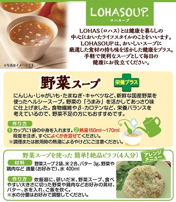 | 原材料 | 名称:乾燥スープ(コンソメ) 野菜エキスパウダー(にんじん(国産)、じゃがいも(国産)(遺伝子組換えではありません)、たまねぎ(国産)、キャベツ(国産))、デキストリン、ホタテエキスパウダー、酵母エキスパウダー、水溶性食物繊維、根昆布エキスパウダー、有機玄米エキスパウダー(国産)、食塩、ネギパウダー(国産)、カツオエキスパウダー、ユズ粉末(国産)、うめパウダー(国産)、かぼちゃパウダー(国産)、うきみ・具(ほうれん草(国産)、にんじん(国産)、パセリ) / ビタミンE、ヘム鉄、β‐カロテン、(一部に乳成分・小麦・大豆・豚肉を含む) |