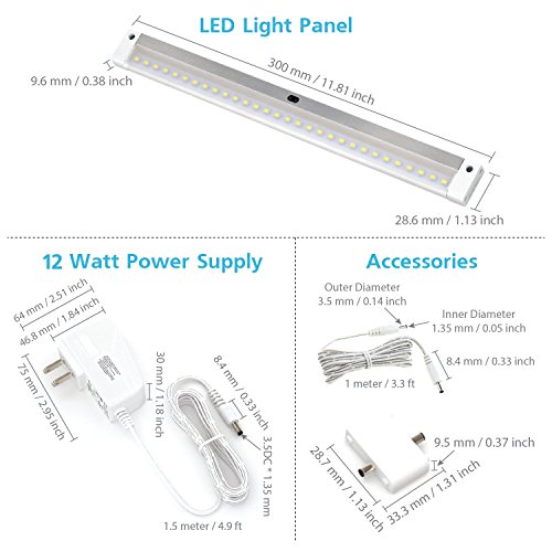 White Finish High Quality LED Dimmable Under Cabinet Lighting 12 inch 3 Panel Kit with 12V AC/DC Are you looking for a few Under Cabinet Lights to brighten up a dark spot in your kitchen, closet, workbench, desk or laundry room? Are remote controlled lights to much of a bother to open when you're cooking? If so, we have the PERFECT solution for you: The Hand Wave Activated LED Under Cabinet Kit by EShine!