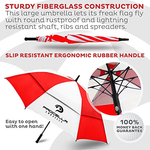 -. Feature : Unser meist-verkaufte Kohlefaser Golfschirm mit innovativem Design bietet absoluten Wetterschutz vor Regen, Wind und Sonne beim Golfen, Gassigehen oder einem Sportevent im Freien. Die 157cm-Spannweite mit doppeltem Schirmstoff und Netz-Lüftungssystem macht ihn komplett windsicher. / Extreme Wetterverhältnisse sind kein Hindernis! Qualitativ hochwertige Handwerkskunst, eine rostbeständige Glasfaserkonstruktion und das windresistente Rahmenwerk machen unseren winddichten Golf Regenschirm leistungsstark. / Zwickfrei dank Automatik Funktion (automatisches Öffnen) - Großer Regenschirm, kinderleicht dank automatischem einfach-zu-öffnen Knopf. Mit einer Hand sofortigen Regen- und Sonnenschutz erhalten! Stabiler, einfach zu schließender Faltrahmen, außerdem super leicht (500 Gramm), extrem handlich auf Reisen. / Sechs Farben mit passender Schutzhülle - Beleben Sie stürmisches Frühlingswetter mit bunten Farben, perfekt für Männer und Frauen; Schwarz, Marineblau, Königsblau & Weiß, Schwarz-weiß, Grün-Weiß und Rot-Weiß - viel Auswahl die ideal zu Ihrer restlichen Ausrüstung im Golf-Wagen passt. / Gratis Golf-Videos und 100% Garantie - Procella Golf Regenschirme auf Amazon kommen mit Garantie. Wir setzen 22 Gratis Golfvideos oben drauf, damit Sie noch mehr von Ihrem Einkauf haben. Falls Sie nicht komplett zufrieden sind, schicken Sie ihn einfach für eine Geldzurückerstattung zu uns.