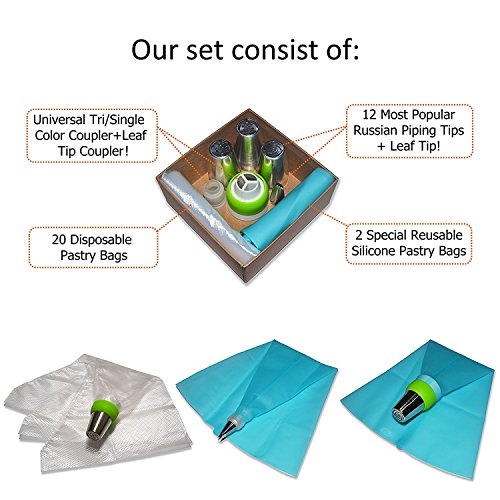 - NOTHING SUPERFLUOUS, ONLY MOST NECESSARY – Our Cake Decorating Kit includes: 12 russian piping tips (1.6" tall, 1.45" in diameter at the base, and 1" at the top), universal tri-color/single-color coupler, leaf tip coupler, leaf tip, 2 Large Reusable Silicone Pastry Bags and 20 Big Disposable Pastry Bags.