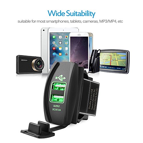 -. Feature : Mictuning 2015 design, input: 12V-30V; output: dual 5V 3.1A, works great as a replacement or extra dual USB charger in car switch panel, with green LED light. / Over-heated, over-current, over-charging protection, charging will be automatically stop when battery is full, easy to use and install. / Compatible with popular mobile devices USB 2.0, any device including digital cameras, PDAs, mobile phones and USB accessories. / As a replacement or extra 12V-30V DC dual USB charger in vehicle. / Color: black - material: ABS + electronic components.