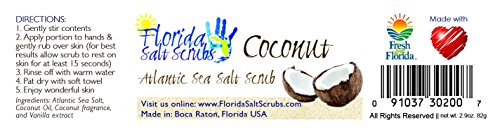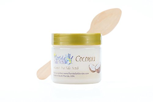 Open the jar and instantly escape to the warm tropical beaches of South Florida and maybe even Key West, through noticing the wonderful Coconut aroma as it awakens your senses. Soon you may feel yourself drifting to a warm, wonderful and relaxing place. The power of pure mineral rich, extra fine Atlantic sea salt combined with natural Coconut is used to create this gentle exfoliating salt scrub that will leave your hands and body feeling silky smooth, rejuvenated, and infused with the wonderful lasting aroma and essence of pure Coconut. Did you know..? Coconut, similar to Vanilla is considered to be a highly relaxing scent! Like all Florida Salt Scrubs products, our Coconut salt scrub is made from only the HIGHEST quality ingredients. Perfect for: lovers of Coconut, gifts, weddings, events, and more. Locals here in Florida will often buy several of the 2.9 oz jars for out of town visitors staying with them. Talking about a wonderful and thoughtful way to welcome out of town guests! How to use your Coconut salt scrub (directions): 1. Open the jar and give contents a stir with supplied spoon. 2. Apply 1 small scoop into the palm of your hand. Gently massage into the skin. If applying to feet, make sure to thoroughly massage it onto the heels. May be used on the entire whole body except face and neck. * Not intended for use on the face and neck. 3. For maximum results, let scrub rest on skin for between 15 seconds and up to 1 minute (no need to go past one minute with our product). 4. Rinse off with warm water. 5. Pat skin dry with a soft towel. Enjoy! Ingredients: Pure Atlantic Sea Salt, Coconut Oil, Coconut fragrance, and Vanilla extract Net Weight 2.9 Ounces (82 Grams). Product Dimensions 2 x 2 x 1.75 Inches.Feature