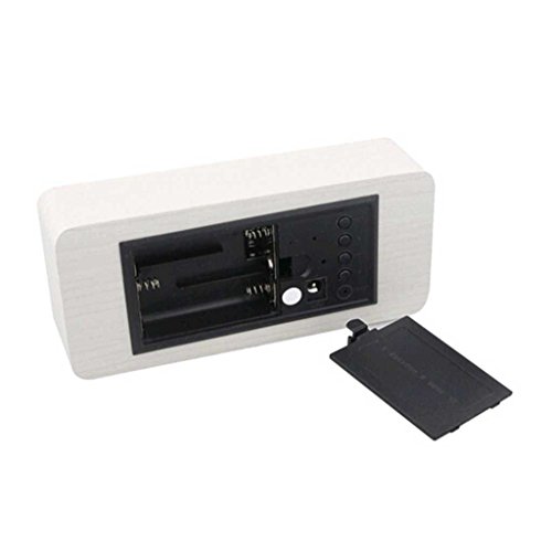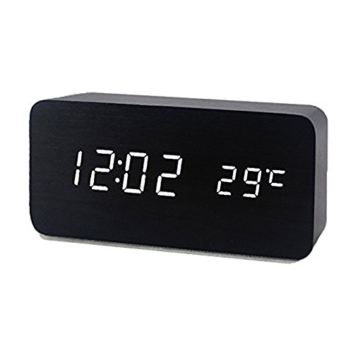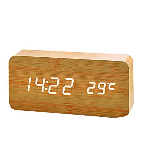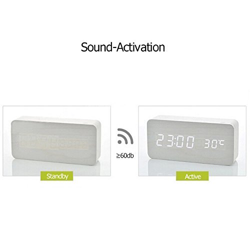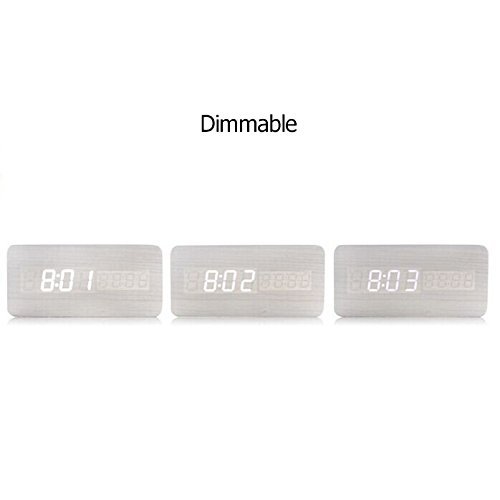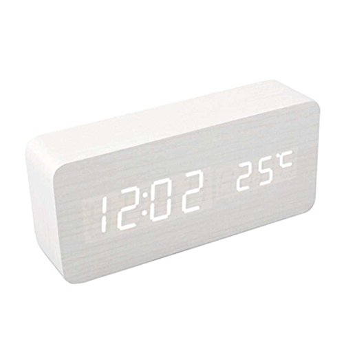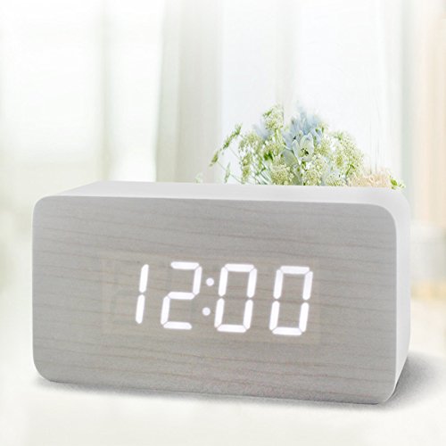Goldmice Rectangular LED White Skin Wooden Digital Alarm Clock, Wood Grain Desk Alarm Clock with Time, Date and Temperature Display, Sound-activated Function, Multiple Color Choices (White)