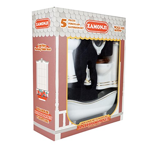 -. Feature : 5-pieces 1:12 scales china bathroom set / Includes: 1 pedestal tub,1 pedestal sink, 1 toilet, 1 mirror, 1 brush holder / Perfect design with lovely gold rim,toilet seat opens and closes / The tub has a pull-chain stopper, a curved faucet, golden feet and an ergonomic tub / This little five piece bathroom set will really make your doll house bathroom feel complete