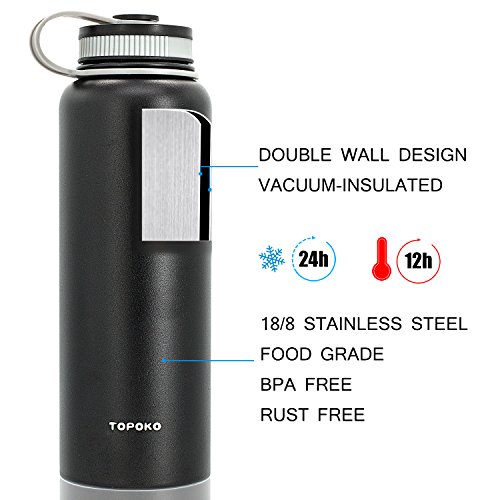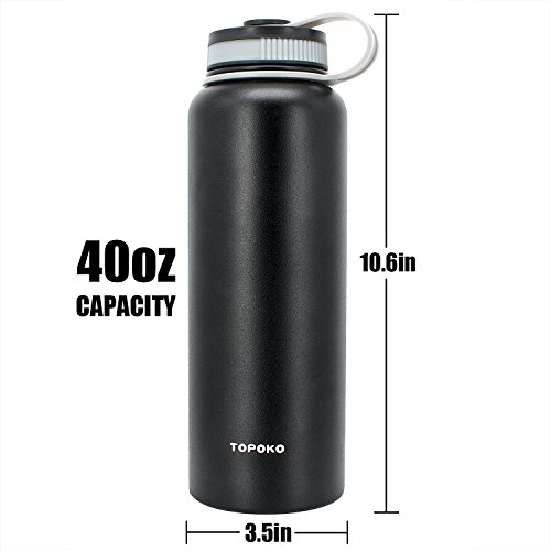 TOPOKO Wide Mouth 40 OZ Capacity Stainless Steel Vacuum Insulated Water Bottle Double Wall Design 100% Leak & Sweat Proof for Hot and Cold Beverages - Includes water bottle Pouch & Coffee Lid.★ Product Features:Color: BlackHeight(with cap): 11 InchesWide: 3.5 Inches Product Capacity: 40 ounces Product Weight: 17.5 OZ Package includes: 1 x Stainless Steel 40OZ Outdoor Sports Water Bottle.★ Product Specifications:➞ TOPOKO is a Trustworthy and Reliable American brand devoted to manufacturing the highest quality sport water bottles available.➞ High Quality MaterialCulinary Grade 304 stainless steel, Environmentally safe and hazard free.➞ Lasts for years Durable and dependable. Rust proof and leak-proof.➞ Ergonomically designed handle and bottle with 42 OZ capacity Spill Proof, easy to carry everywhere.➞ Lightweight design sports kettle perfect for your gym bag, car, bicycle or backpack to enjoy your long hikes, rides, drives, yoga class, road trips, or any other activities.Notice: 1. 1. Please allow 0.1-0.8Inches error due to manual measurement. please make sure you do not mind before you make a purchase.Feature