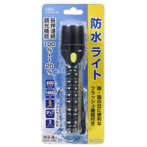 雨・霧の日に便利なフラッシュ機能がついたIPX7(防浸形)仕様のLEDライトです。 製造国:中国 付属品:ストラップ×1 ※サプライヤー直送品 ご注文後2~3営業日後の出荷となります【商品名】オーム電機 OHM LED防水ライト LH-W9710G-10W