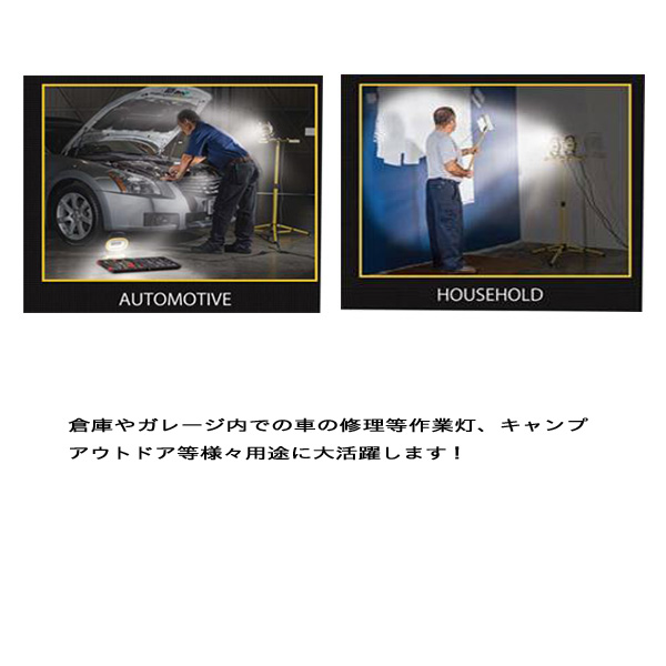 ●倉庫やガレージ内での車の修理等作業灯、キャンプ、アウトドアライトとしても活用できます。
