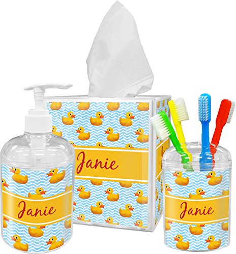 -. Brand : RNK Shops -. Color : Yellow -. Feature : YOU WILL RECEIVE AN EMAIL WITH A LINK TO CUSTOMIZE YOUR ORDER WITHIN 1 BUSINESS DAY / Custom P.R.Inted with Your Design / 3 piece set / Inserts P.R.Inted on premium gloss media / Vibrant, colorful design -. Label : Mom Innovations -. Manufacturer : Mom Innovations -. MPN : mi-bath-acc-bundle+573698 -. PartNumber : mi-bath-acc-bundle+573698 -. ProductGroup : Home -. ProductTypeName : HOME_BED_AND_BATH -. Publisher : Mom Innovations -. Studio : Mom Innovations -. Title : Rubber Duckie Bathroom Accessories Set (Personalized)