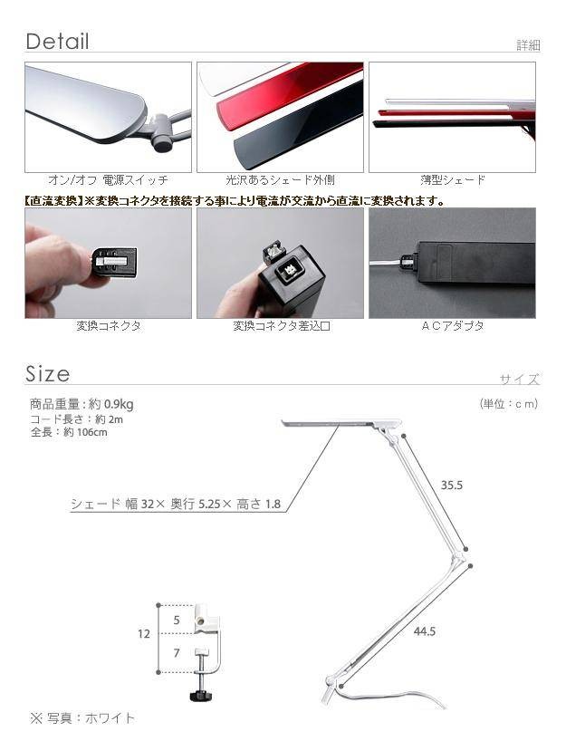 商品について:ちらつき・紫外線・電磁波ゼロのLEDライト搭載でデスクワークなどを快適にサポート♪10.5Wの消費電力で100W電球相当の明るさ、5万時間の超長寿命を誇るエコ仕様。マルチクランプタイプ(厚50mmまで)で取付け自在