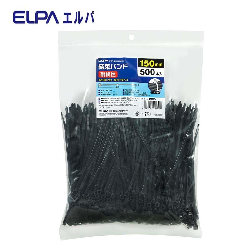 紫外線に強く、屋外で使えます。 製造国:中国 素材・材質:66ナイロン 商品サイズ:全長150×幅3.6mm 仕様:500本入最大結束内径:35mm引張強度:18.2kg使用温度範囲:-40度~+85度 ※サプライヤー直送品 ご注文後2~3営業日後の出荷となります【商品名】ELPA 結束耐候 150MM KBF-N150500BK