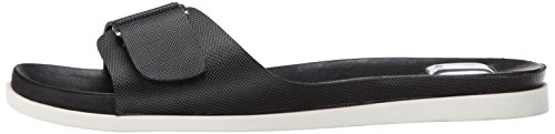 Slide-on sandal in textured finish featuring buckle with hook-and-loop closure