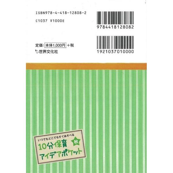 【商品基本情報】 商品名称:10分保育アイデアポケット 秋 著者/出版社:阿部 直美/阿部 直美 初版発行日:2012/09/25 サイズ:文庫判 ページ数:127 ISBN/JAN:9784418128082/4528189458178