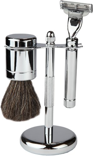 3 Piece Shaving Set With Mach 3 All Metal Heavyweight Handle and 100% All Metal Heavyweight Badger Brush, With All metal Chrome Textured Stand