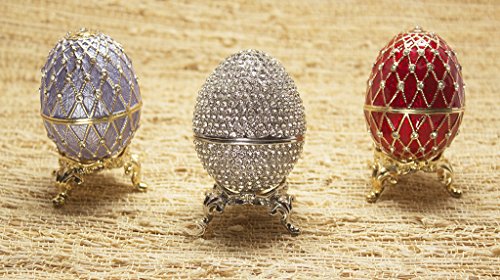 This elegant Faberge style Egg Box is set with lots of genuine Swarovski crystals for a graceful sparkle. It has been meticulously hand enameled. An easily removable, velvet ring insert is included to create a beautiful jewelry presentation. (This red egg also comes in blue and purple.) A graceful display stand is included with this box. Truly splendid!Height: 3.25inches