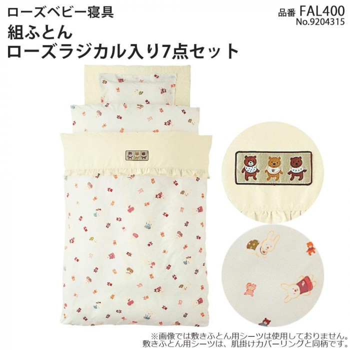 | うさぎやくまが描かれた組ふとん7点セット。赤ちゃんのからだにフィットしやすいキルティングを施した掛けふとんと、赤ちゃんの背骨をしっかり支えるローズラジカル敷きふとんで、赤ちゃんの快適な眠りをサポートします。 |