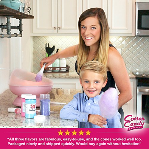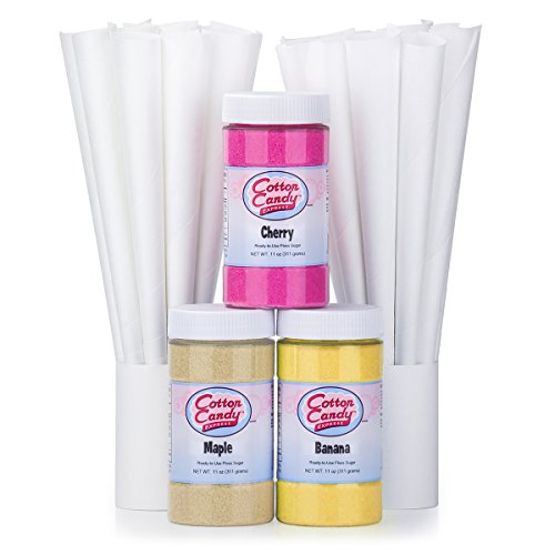 Cotton Candy Express Fun Pack | Kit Features Maple, Banana & Cherry Floss Sugars (11 oz Each) & 50 Paper Cones | Best Cotton Candy Maker Supplies | For Home or Commercial Use