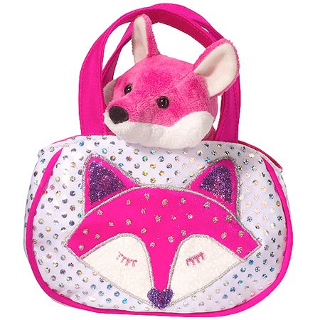 7" wide Shimmering Fox Sak Sassy Pet Sak with stuffed pink fox in soft white plush with shimmering silver dots. Embroidered fox face with glitter and extra shimmer add a touch of fun and shine! Removable stuffed pink fox! AGES: 24 Months & Up Washing Instr.: Surface WashFeature