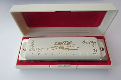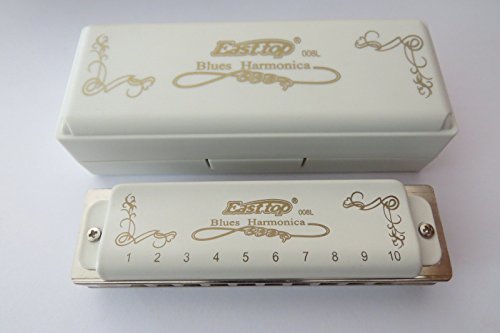 Product Description Easttop 10 holes diatonic blues harmonica,D key Mould no:T008L-D Material:phosphor bronze reeds,brass reedplate(1.2mm thickness) with electroplate,brass cover with white paint,Acrylic comb Key: D key Packing:each harmonica add one small cloth into one plastic box Content:harmonica small cloth plastic box Harmonica colour:white Maintain and clean tip: Use 70% ethyl alcohol,and spray on the cover and comb,after about 15 seconds,use the cloth to wipe the surface. No heat,no hair dryer,no sunlight,just air-dry. If there's some small things in the comb,you can brush lightly with a very soft brush.Do not use sharp tool,it will damage the reeds. If you want to open the cover,pls be carefully to save the screw. 0