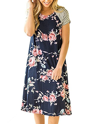 Floral print knee length dress women's short sleeve flower miidi casual a-line dress