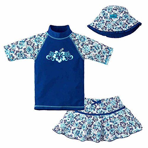 Set includes: 1 top, 1 skirt and 1 bucket hat. Made of soft breathable quick drying microfiber. Top has flat lock seams for ease and comfort. Sizes 12/18 Months and 2T tops include snaps in back of neck for ease of dressing. Skirts include fill lining, elastic waist and working drawstrings. Size 12/18 Months swim skirts include waterproof liner. Bucket hats are reversible. UPF 50+ sun protection. Top, Skirt and Hat Shell: 87% polyester, 13% elastane. Hat Lining: 100% polyester. Machine wash cold gentle cycle.Feature