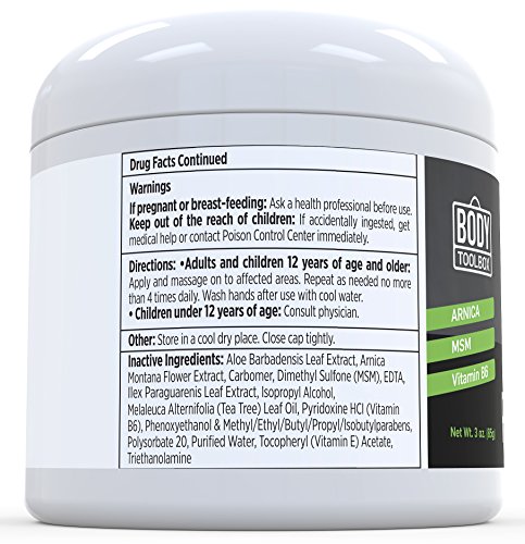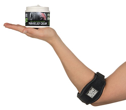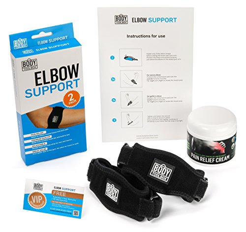 Studio : Body Toolbox Publisher : Body Toolbox Binding : Health and Beauty Product Description Get instant pain relief without the meds with the: Tennis Elbow Brace Pain Relief Cream by Body Toolbox Address repetitive arm motion injuries such as: Tendonitis - Tennis Elbow Lateral Epicondylitis - Golfer's Elbow Medial Epicondylitis - Arthritis - Radial Tunnel Syndrome - Cubital Tunnel Syndrome - Ulnar Nerve disorders - Elbow Hyperextension Pain. The best forearm brace / elbow strap to complement or replace a tendonitis elbow sleeve. Soft firm gel compression pad - for comfort, muscle stability improved blood flow during arm motion activities. "Dual Velcro clasp system" - for a fully adjustable tailored fit on the right arm or left arm. Generous cushioning - to cover the entire pain area for targeted pain relief. Tight secure stitching seam work - for durability long extended use over time. Durable, thick flexible high grade neoprene - provides superior breathability, strength resilience over cheap inferior alternatives from the doctor's office or your local drug store. Multiple uses for sports everyday activities. The cream is a unique non-pill pain relief treatment that spreads evenly and effortlessly across the body absorbs deep into the skin to target areas of pain experienced in joints and muscles. Key ingredients are: Menthol 3.7% (Active Ingredient) - Provides deep penetrating pain relief, cools the skin works as a local Anesthetic. Arnica Montana Extract - A powerful anti-inflammatory that helps to increases circulation. Vitamin B6 (Pyridoxine) - Helps promote normal nerve function. MSM - An anti-inflammatory that supports healthy connective tissues. Ilex Leaf extract - Natural caffeine that increases circulation conditions the skin. Tea Tree Oil - Penetrates skin accelerates skin healing. Vitamin E - Anti-inflammatory that enhances blood circulation hydrates skin. Aloe - Anti-inflammatory properties that softens hydrates skin. 0
