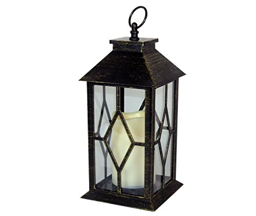-. Feature : BRUSHED GOLD LANTERN. Plastic lantern with glass panels already assembled. Warm white flickering flameless candle included. ON/OFF switch and timer function included on the LED candle. Weatherproof lantern makes this the perfect accent outside on a patio, deck, in a garden, line a pathway, up and down a stairway, hanging from a tree, on a tabletop, in a bookcase, on top of kitchen cabinets or on a front porch entry way. / FLAMELESS CANDLE WITH TIMER. Requires 3AAA batteries (NOT INCLUDED). The LED candle has a nice, soft, warm flickering glow. Since the candles are flameless they are smoke free and worry free. Safe to use around pets and children. Perfect for those night sitting out on the deck, by the beach or at the lake. Each lantern comes with a loop at the top so you can hang it anywhere. / POWDER COATED LANTERN. Cool diamond shaped pattern goes with any decor. Lightweight design makes this lantern easy to take on a the boat, camping, in a motor home, rv park or on a dock. / DECORATIVE LANTERNS FOR INDOOR/OUTDOOR. This is the perfect gift for new neighbors, newlyweds, aunts, uncles, moms, dad, grandma, grandpa, friends, co-workers, teachers or new brides. / LANTERN SIZE: 13"H, CANDLE: 3" x 4.5". DECORATIVE USES: display on a fireplace mantel, tabletop centerpiece, kitchen, bathroom, living room, window sill. WATERPROOF WEATHER RESISTANT