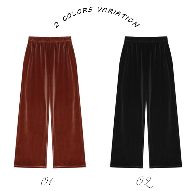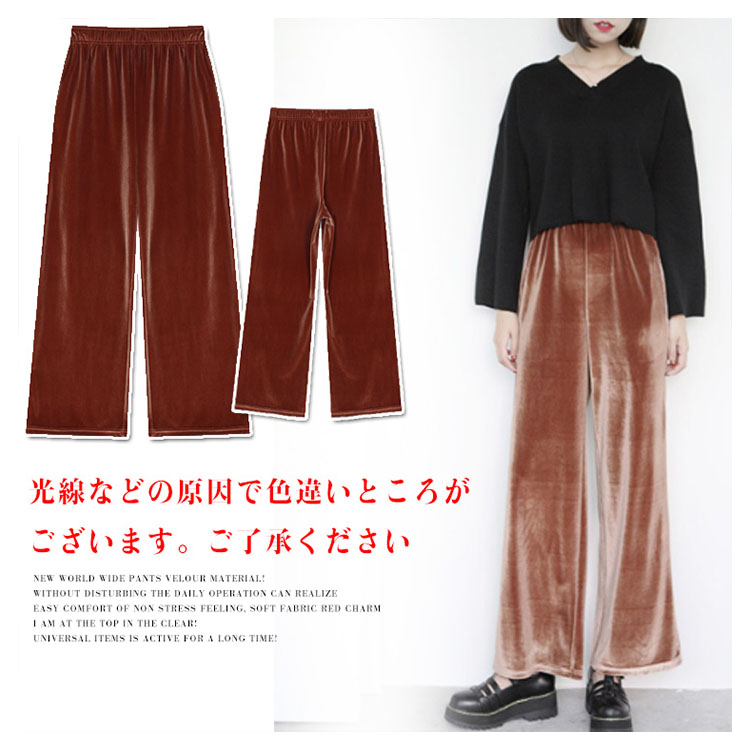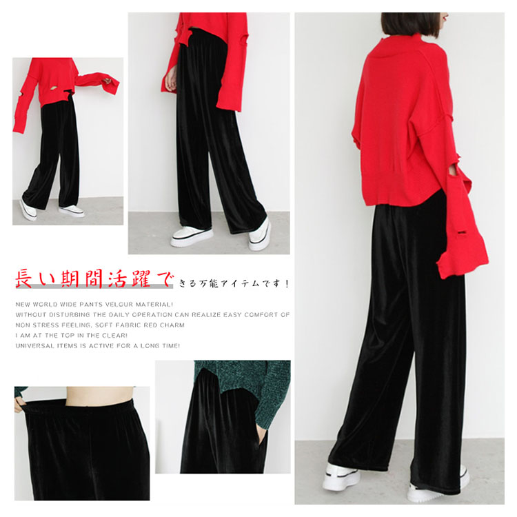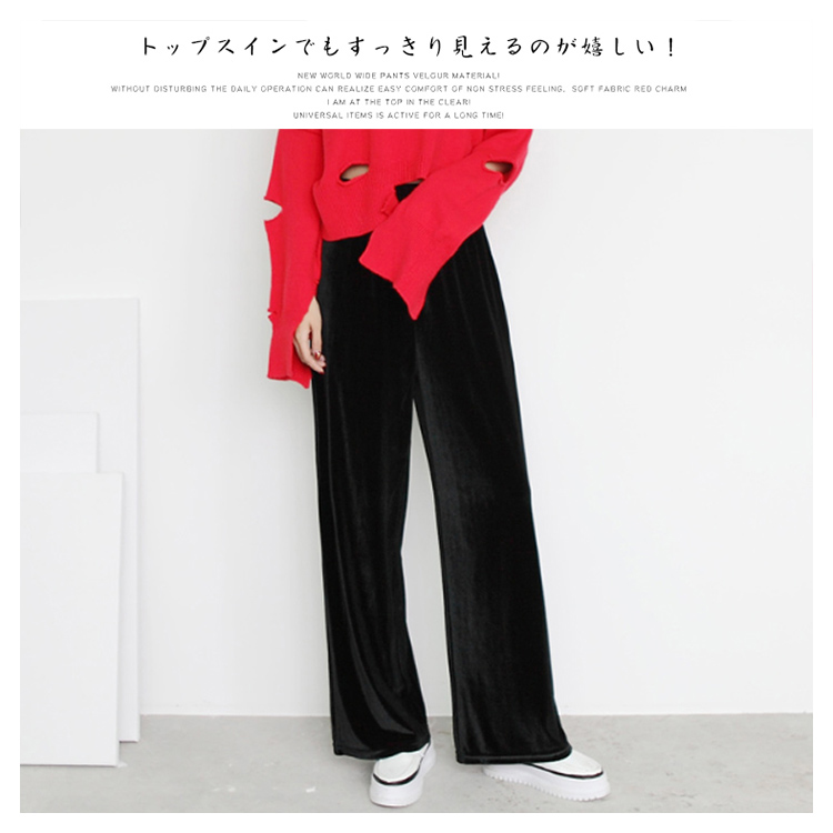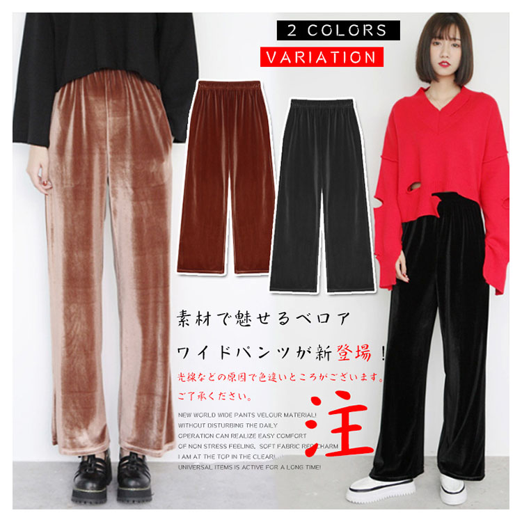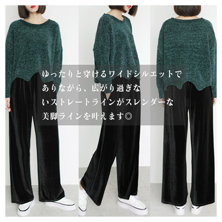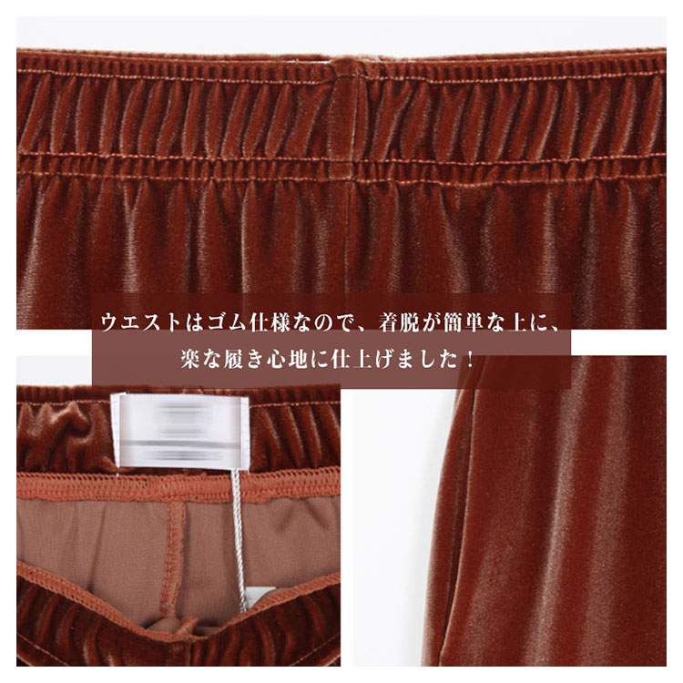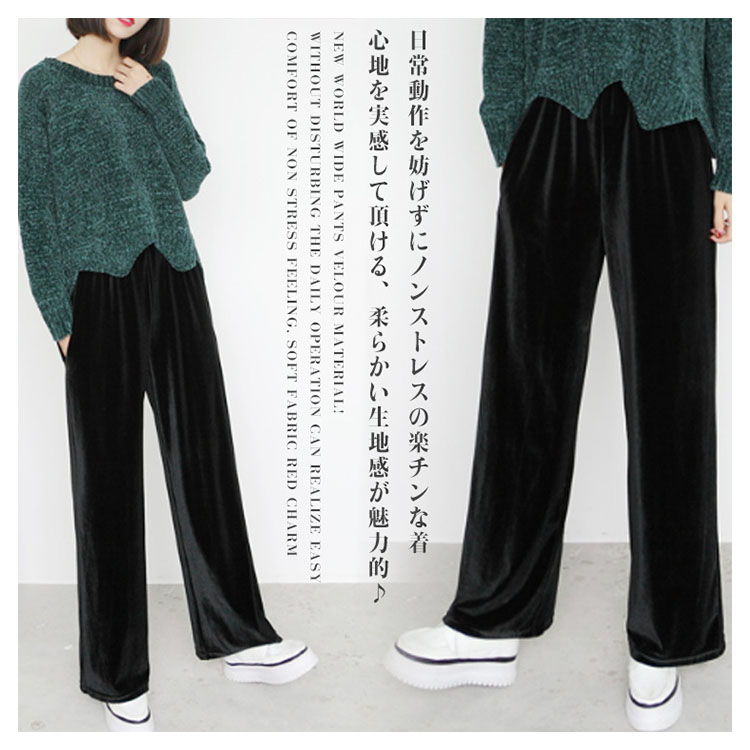 | 素材で魅せるベロアワイドパンツが新登場! 日常動作を妨げずにノンストレスの楽チンな着心地を実感して頂ける、柔らかい生地感が魅力的♪ トップスインでもすっきり見えるのが嬉しい!長い期間活躍できる万能アイテムです! | |