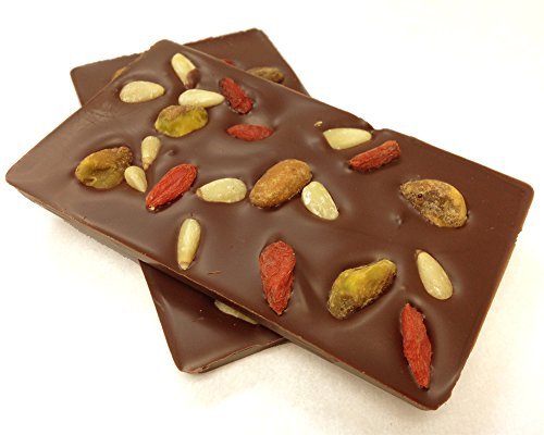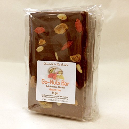 -. Binding : Misc. -. Brand : U Chocolate for the World -. Feature : Made with 100% sustainable premium Swiss 58% dark chocolate free of GMOs / Gluten Free / Package of 5 individually wrapped gourmet bars -. Label : U Chocolate for the World -. Manufacturer : U Chocolate for the World -. PackageQuantity : 1 -. ProductGroup : Grocery -. ProductTypeName : GROCERY -. Publisher : U Chocolate for the World -. Studio : U Chocolate for the World -. Title : Go-Nuts Dark Bar, Swiss 58% Dark Chocolate with Organic Goji Berries, Pistachio & Pine Nuts