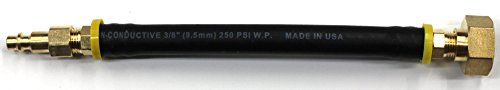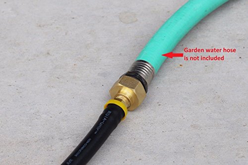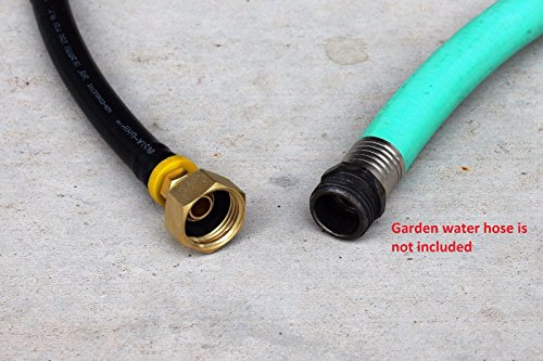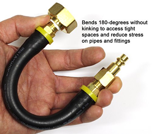 Flexible hose allows the adapter to access tight spaces and minimizes stress on pipes and fittings. Pre-assembled length: 10 inches (approximate). Pressure rating: 250 psi. 100% outdoor rated, virtually indestructible, impervious to water and oil.