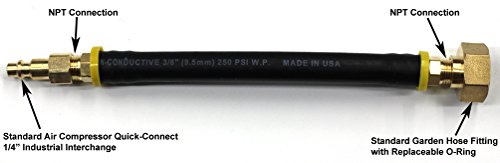 Easily connects to air compressor and garden faucet to winterize lawn sprinkler systems, faucets, and plumbing to prevent damage due to freezing. Compatible with standard garden hose threading and air compressor quick-connect commonly found in North America.