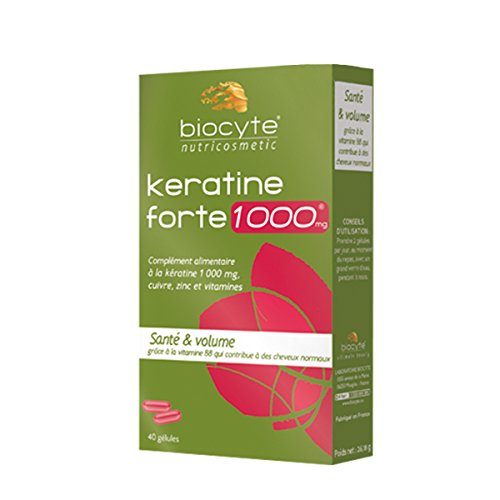 -. Feature : Biocyte Kera tine Forte 1000mg 40 Capsules is a dietary supplement for every person who want to keep healthy hair and in good healthy. / This supplement is particularly recommended if your hair are exposed to the weather of every day : sun, wind, sea, and also to the inconvenience of daily such as pollution, hair colour or permanent. / This food supplement is based of numerous actives like keratin, zinc, copper, vitamin B8, vitamin B6. / Find beautiful healthy hair !