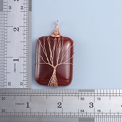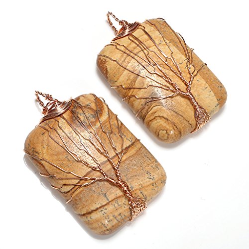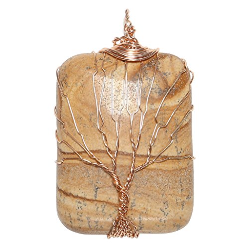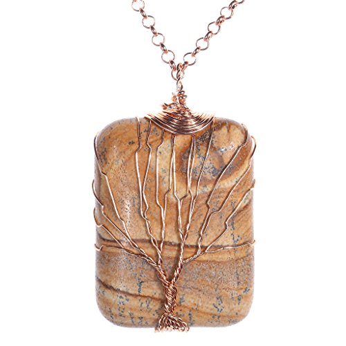 Top Plaza Wire Wrapped Tree of Life Natural Gemstone Rectangle Pendant Necklace Healing Crystal Chakra Jewelry for Women - Picture Jasper