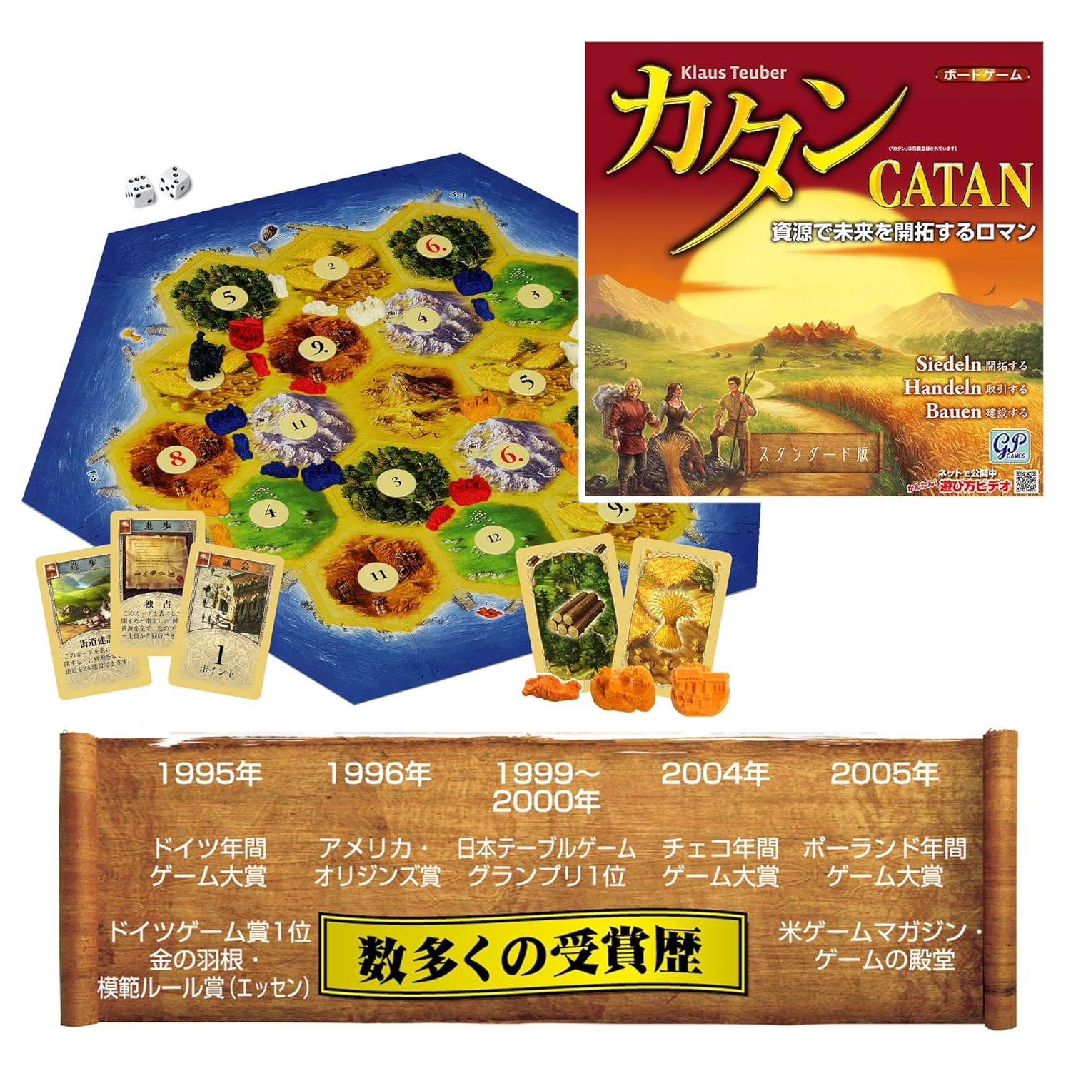 世界のボードゲームの中で2000万個以上の販売数を誇る超大ヒットゲーム! シリーズの基本となるスタンダード版です。カタンという無人島を舞台に、拠点となる開拓地(家)を建ててそこから島全体を開拓していきます。対戦相手との開拓競争で、最初に10点取った人が勝者になります。 具体的には、サイコロによって獲得した資源で開拓地を建てていきます。必要な資源が集まらない時は対戦相手と資源の交換をしましょう。積極的にコミュニケーションでゲームを有利に進めることができます。小学生から遊べるほど簡単なルールでありながら、大人もハマるボードゲームの決定版です!【特徴1】 このゲームはマップを変えることができるので、毎回違う展開が楽しめます。【特徴2】 資源の交換を通して会話を楽しむことができます。この会話はアナログゲームだからこそ味わえることの1つで、相手との新密度が深まりゲームが盛り上がります。【特徴3】 資源を交換してもらうためには自分も協調する必要があります。相手とのバランスを見ながら物事(ここではゲーム)を進めていくことは、教育の重要な要素の1つです。またサイコロやポイントの計算などで簡単な計算力も養うことができます。※「カタンの開拓者たち スタンダード版」からパッケージ、タイル、カードのデザインがリニューアルした改訂版です。ジーピーから発売されたカタンシリーズの各拡張版と組み合わせ可能です。